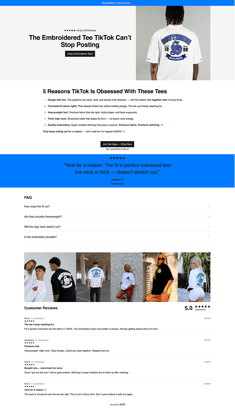 Tell Juno who the audience is and what angle you want to test. It builds the full funnel, landing page, product page, and cart, in minutes. Not days. Not weeks. Minutes. Now there’s no excuse not to test.